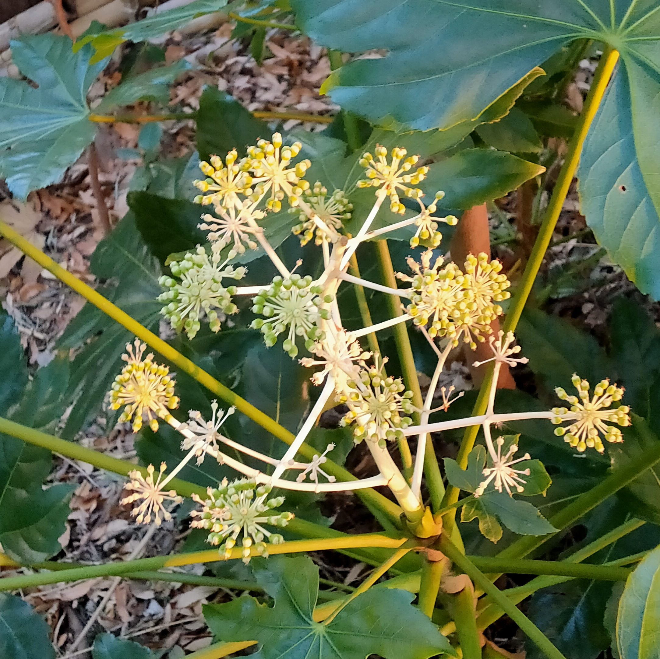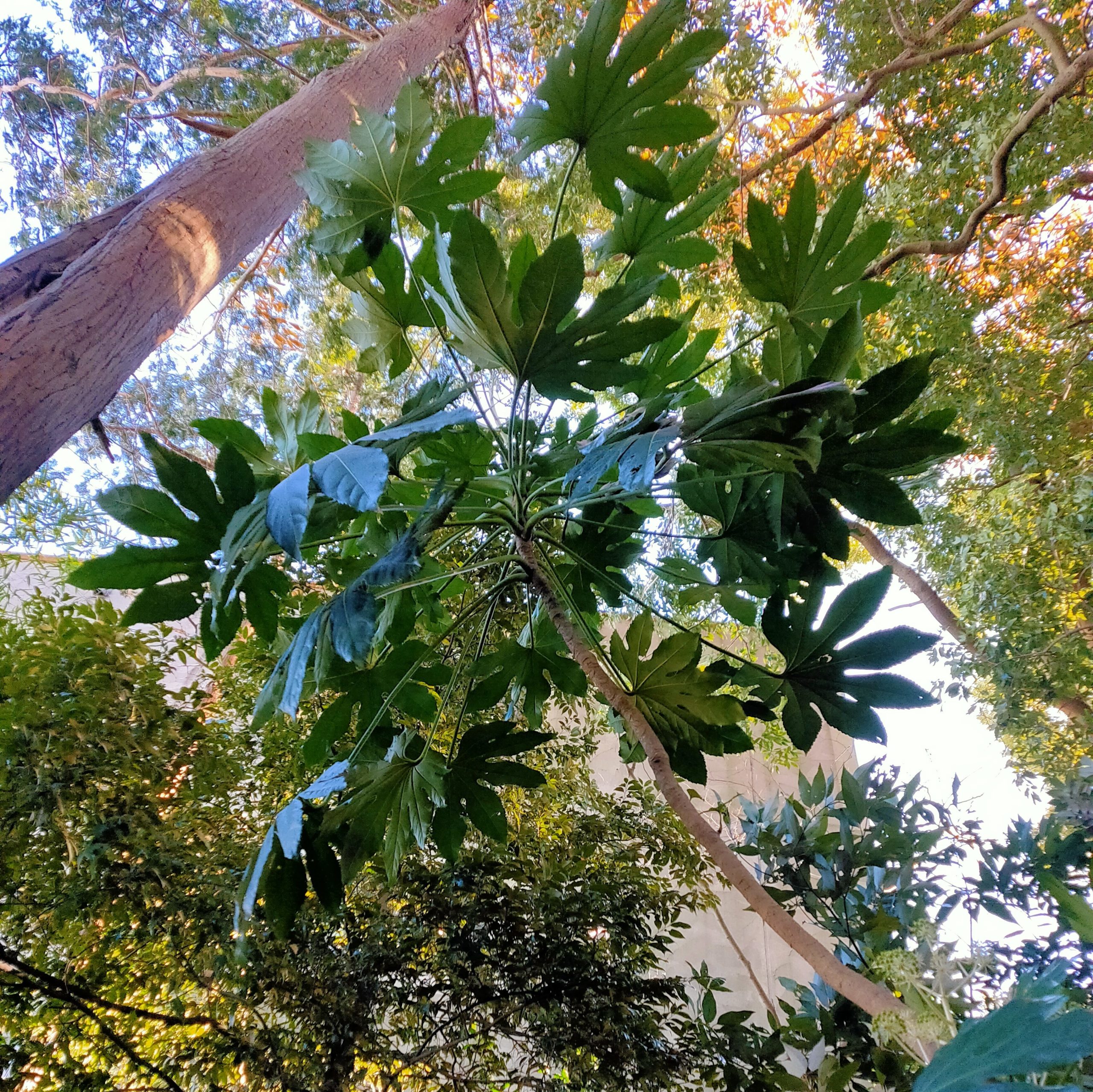 掌状の大きくて厚い葉が特徴です。この季節に白い花が咲きます。この花の咲き方を円錐花序と呼びます。陰樹として馴染み深い木です。低木というけれど、この木はS字に伸びながら4メートルもあります。