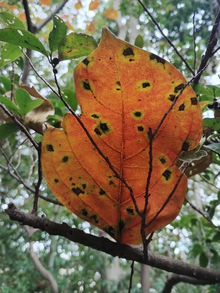 赤い色つまり紅葉はアントシアニンで日射による細胞の破壊を抑えて、光合成をより長く続けようとしているあらわれだ。一方、黄葉は、光合成を強力に行うクロロフィルが抜け、カロテンのみで維持している状態。次には葉の栄養は、枝幹を通じて樹体に戻っていき、春の出葉のために蓄えられる。また、離層形成と言って、葉を林床に積極的に落とす機構をそなえている。勢いよく葉が落ちるのは健康な証拠。衰弱した葉は付いたままのことも多い。