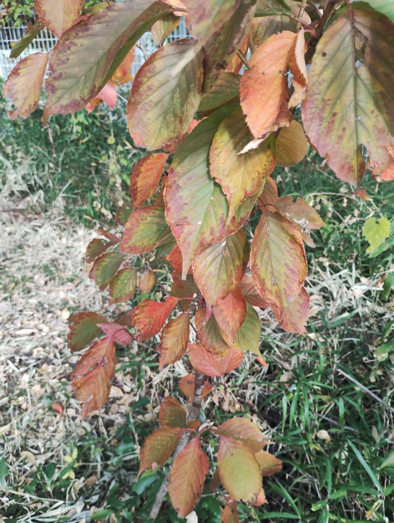 そのせいか、赤い葉も、黄色い葉も多く緑、赤、黄が降り混ざって錦秋の風情となっている。サクラは早期落葉などで葉の赤さを楽しむことがなかった最近だが、今年は朱色というか黄色味がかった淡い赤の葉が、落ち着いたムードを醸し出している。