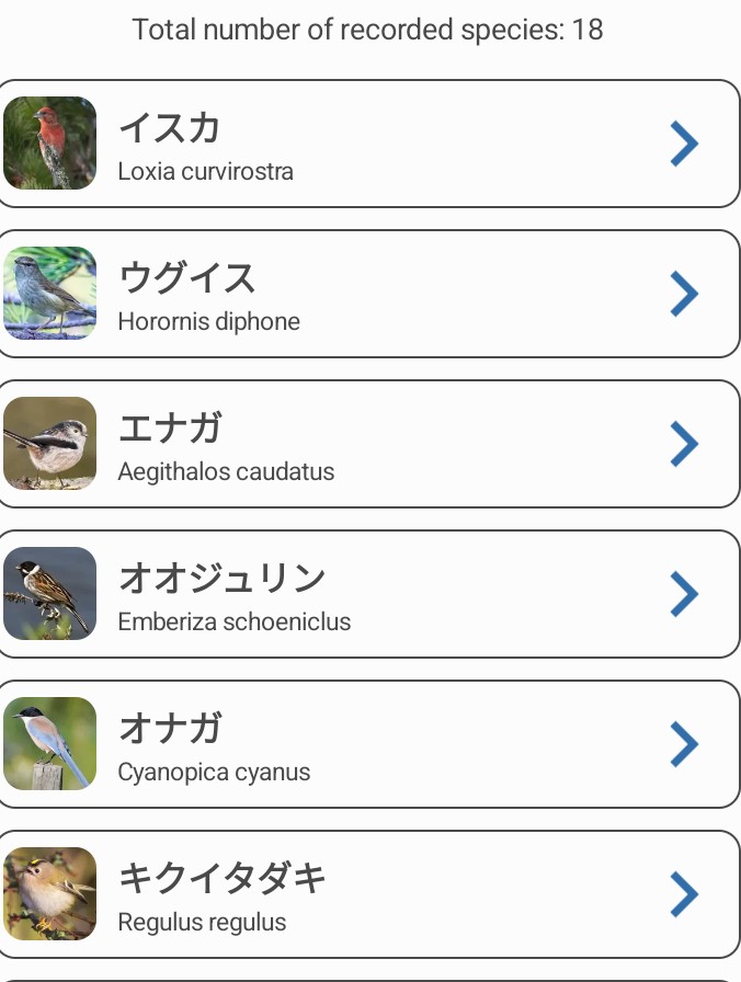 そんな折、BirdNETというスマホアプリを同期の樹木医から紹介された。この森では、幹周15㎝以上の樹木はすべて調べている。昆虫の調査も手を付けはじめている。だが、鳥類はいいカメラがないのと、静かに待つことができないので、手がつけられないでいた。とりあえず使ってみた。鳥のさえずり、音声を頼りにAIで種を判別しようという試みだ。あっという間に、21種の鳥がリスト化された。まず、ありえないだろうという種を3つ削除したが、イスカ、ウグイス、エナガ、オオジュリン、オナガ、キクイタダキ、キジバト、キバシリ、クサシギ、クマゲラ、シジュウカラ、シメ、ハシブトガラス、ヒヨドリ、ミソサザイ、メジロ、ヤマガラが現れた。(クサシギはおそらく間違い)