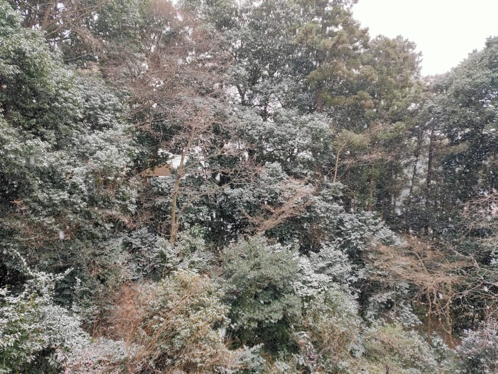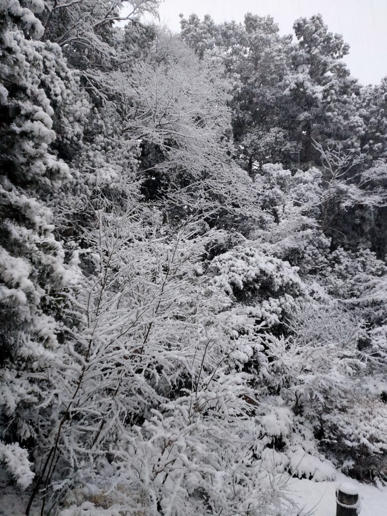 雪は、森の樹木の序列に大きな影響がある。湿った大雪になると、常緑の広葉樹は打撃を受け、しばしばスダジイなどの大枝が折れる。大木となったハッサクなど柑橘系は見ていて痛ましい。