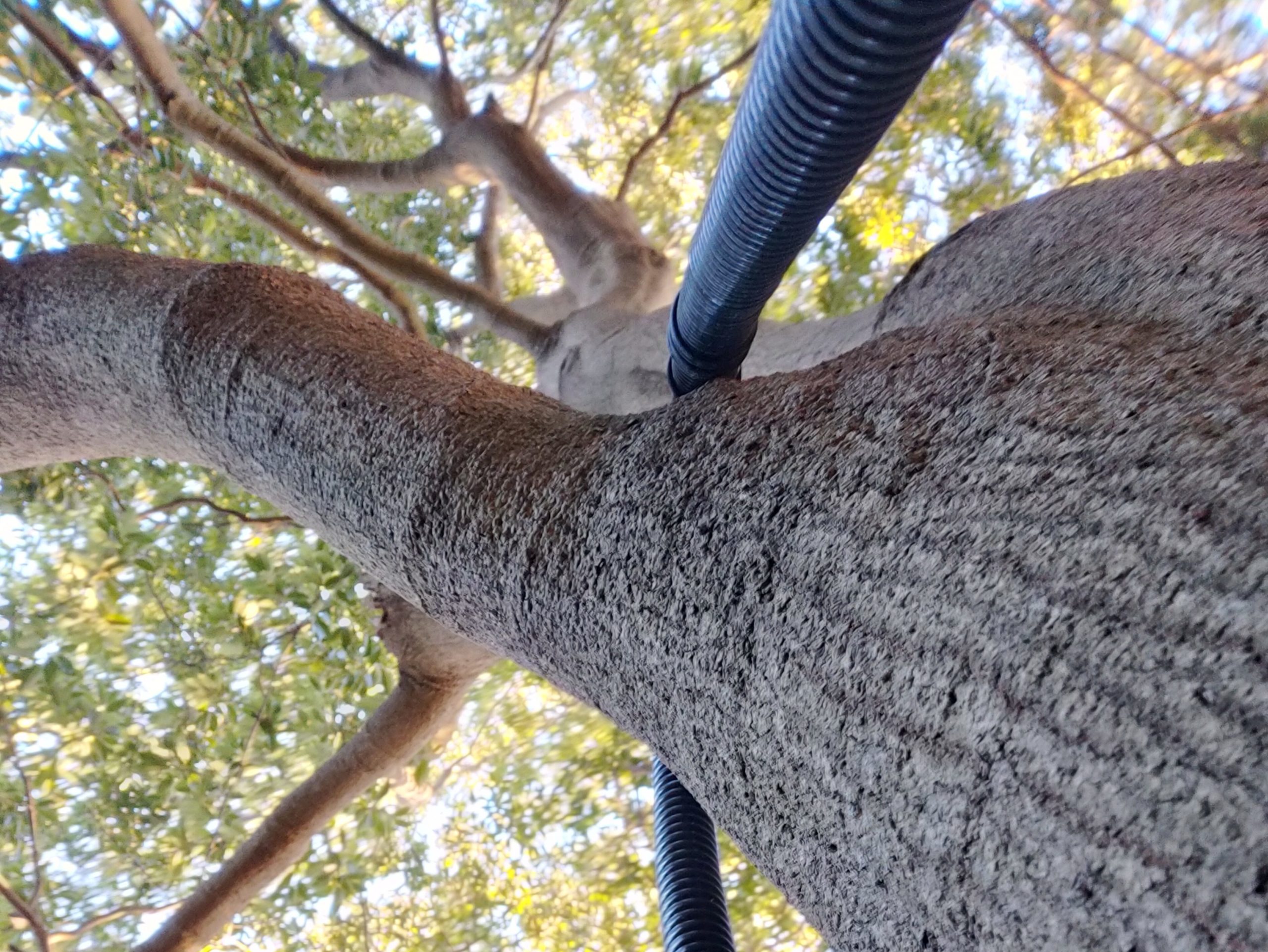 9m位の枝にラインで括った砂袋を掛け、砂袋(スローウェイト)を地面に降ろしたあと、ラインの端部にロープを結び、ロープを掛けた。この高さは、手投げでも割と届く場所だ。立派な木で高さ20mはあると思う。