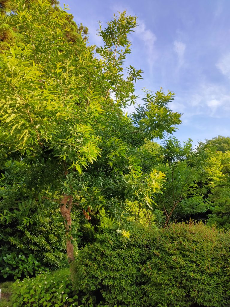 かくして、今年は、出葉前に剪定し、クヌギのファイトアレキシンの力を保ち、バランスの取れた生態系を作ろう心がけた。よく葉を見れば、色々な虫の食痕があり、ゾウムシ、テントウムシ、クモなど色々な生き物がやってきて、クヌギを中心に生態系を作っているようだ。アブラムシに覆われる樹木が美しくないのは、多様性がないからだ。葉にいろいろな形の欠損があるのは、多様性のあらわれとみてよいのではないか。虫が多ければ、鳥もやってくるのだ。