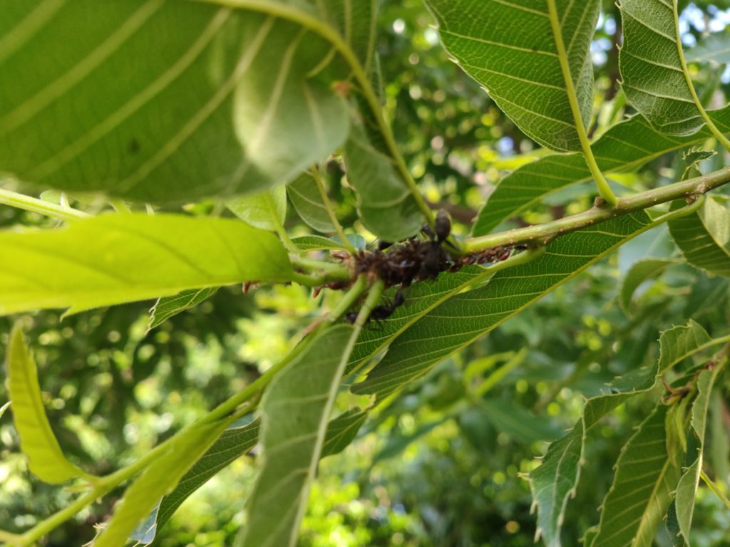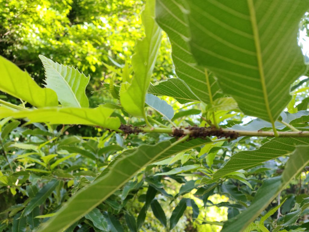 数年前まで、このクヌギは夏までに2、3度剪定をしていた。去年は試しに、剪定を最小限に抑えたところ、違いは、虫つきに現れた。薬を使わないので、アブラムシが結構な数で発生し、クロオオアリがアブラムシを守っていた。