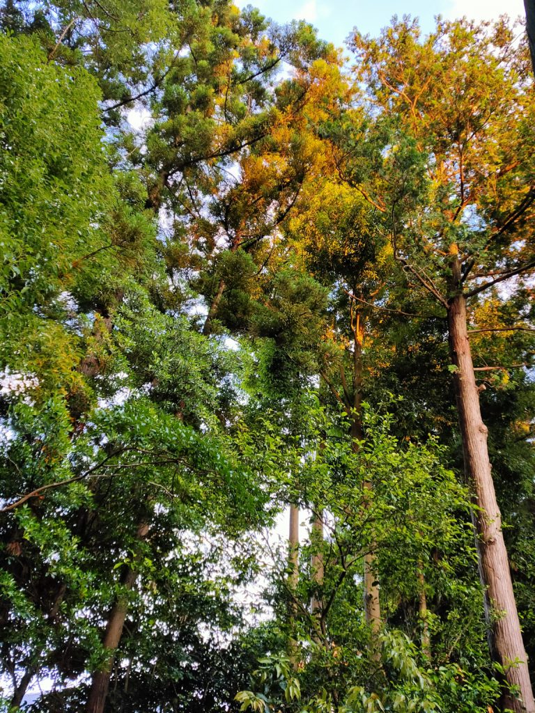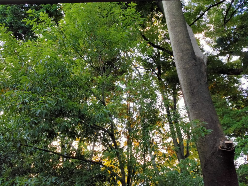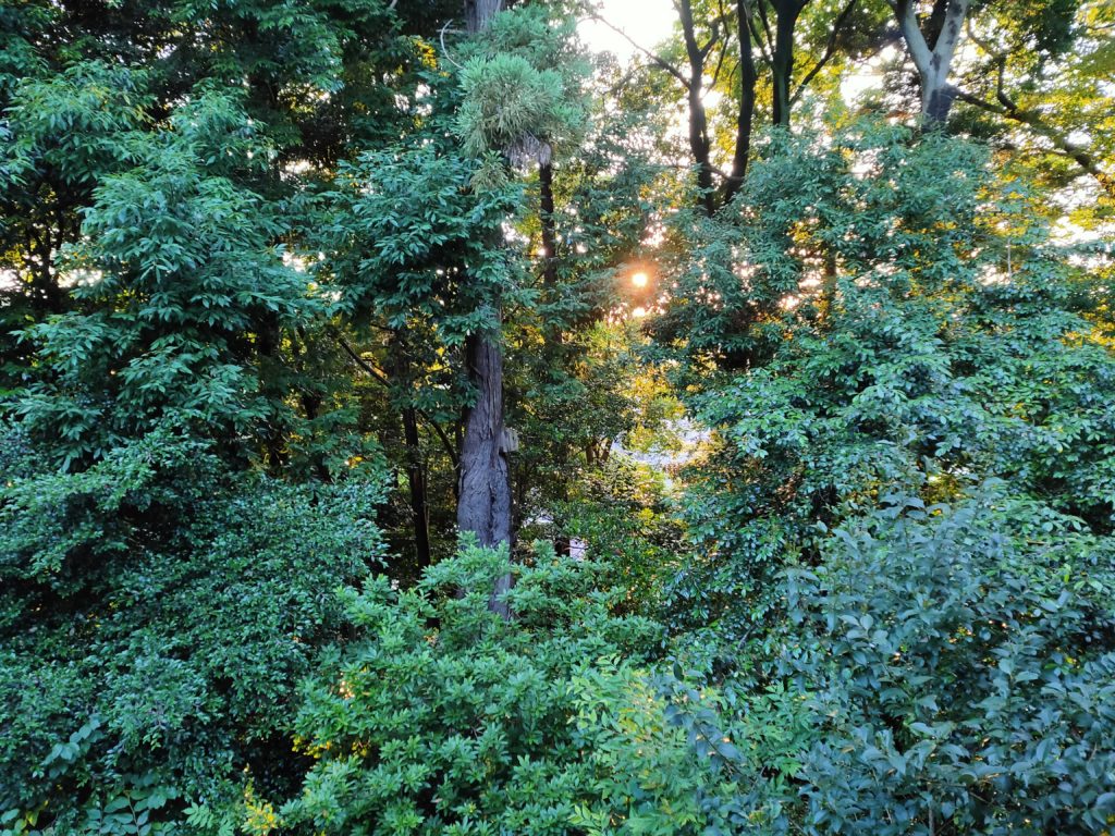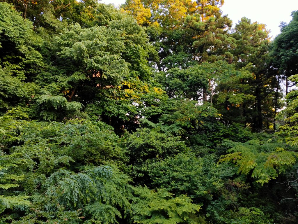 さきほど強い雨が降ったらしい。しっとりと空気が澄んでいる。夕暮時の森は、次第に緑の明度が下がり、やがて闇となる。