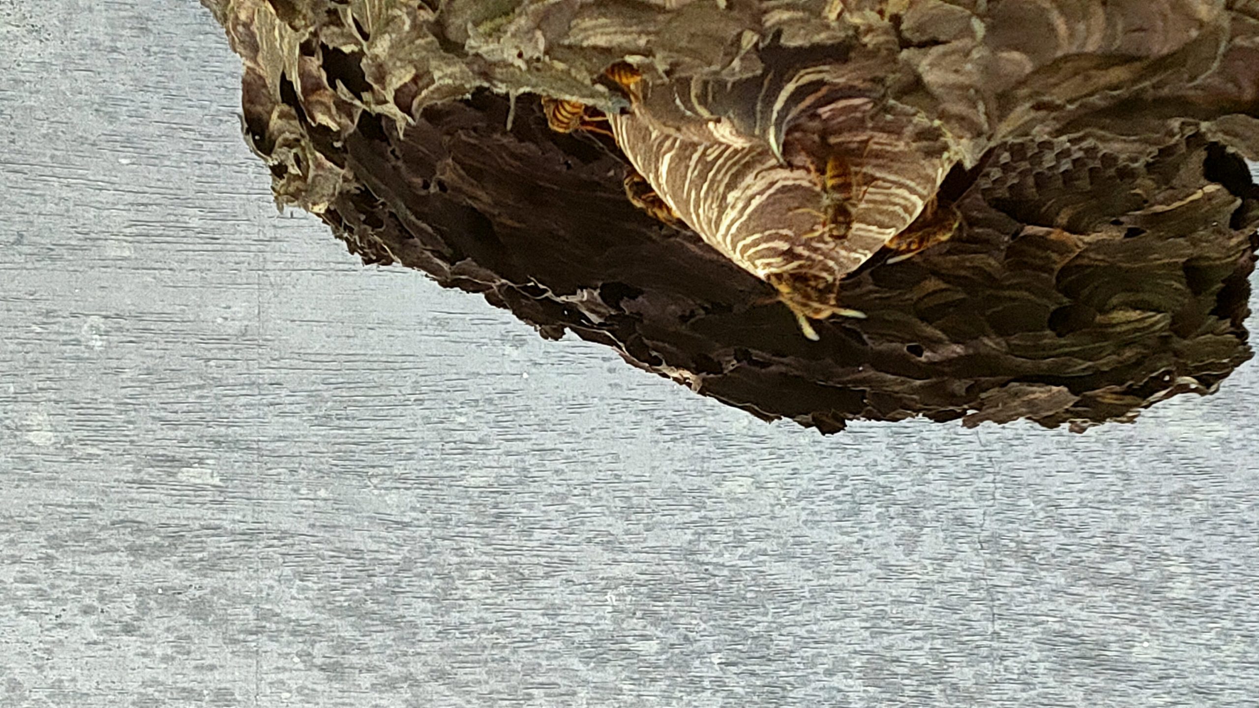 この場所へのキイロスズメバチの営巣は、ほぼ20年ぶりである。その前は7-8年連続して、軒裏に営巣していた。巣づくりをやめていた理由は、毎年オオスズメバチの攻撃を受け、何年か営巣は途中放棄、以降つくることはなくなった。実はこの2年、オオスズメバチの駆除があり、去年の夏には7段の大きな巣が地面から掘り出された。当時予想したとおり、キイロスズメバチにとって棲みやすい環境になったようだ。キイロスズメバチはなんでも食べるらしく、樹木の被食も減るかもしれない。カシノナガキクイムシも食べてくれればうれしいのだが。