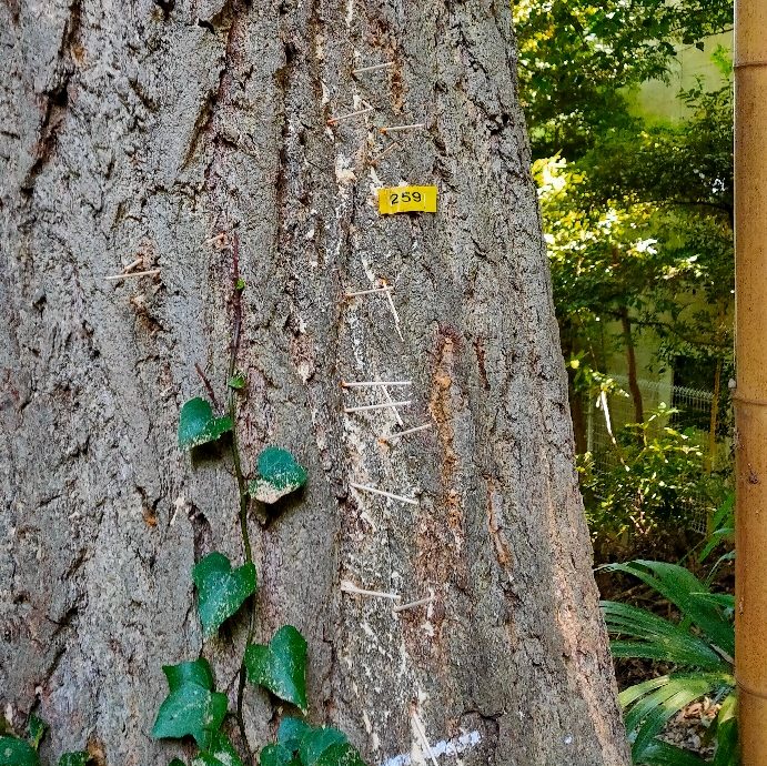 ついにナラ枯れを起こす、カシノナガキクイムシの穿孔が天神山の大径木にあらわれた。まだ、入ったばかりだと思われる。このところ、乾燥と高温が続いていた。気がついた時は、あいにく私はコロナ罹患療養中で、監視の目が甘かった。