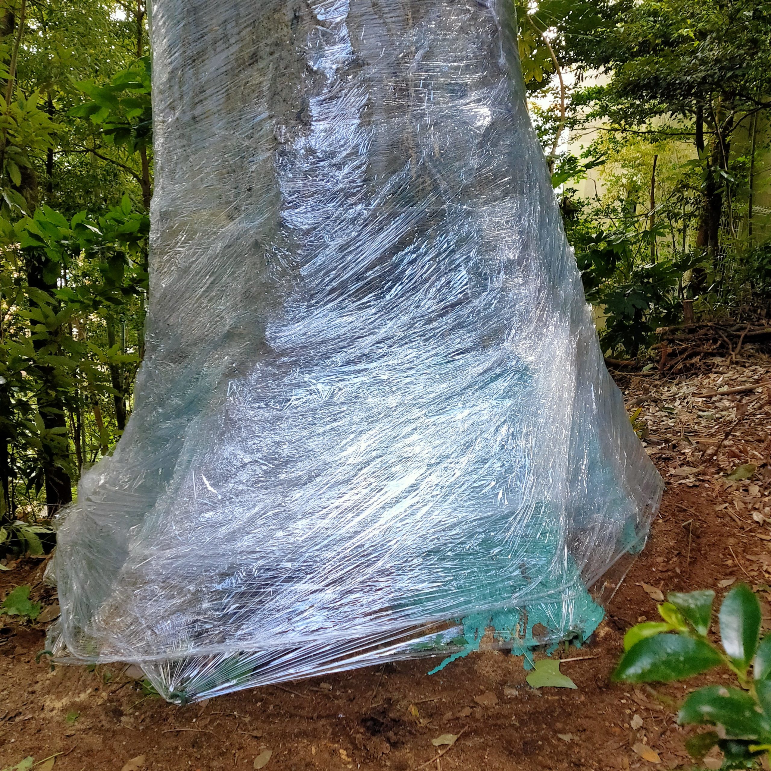 ストレッチフィルムは、幅500mm長さ300m厚さ15μmのものを使った。数えていないが40巻き位はしたと思う。途中、いくつもの虫たちが行き場がなくなり閉じ込められた様相だ。フィルムは腹巻状なので、時間をかければ脱出できるだろう。足元は、実は一番穿孔が多い。ここは、対策を徹底する必要がある。