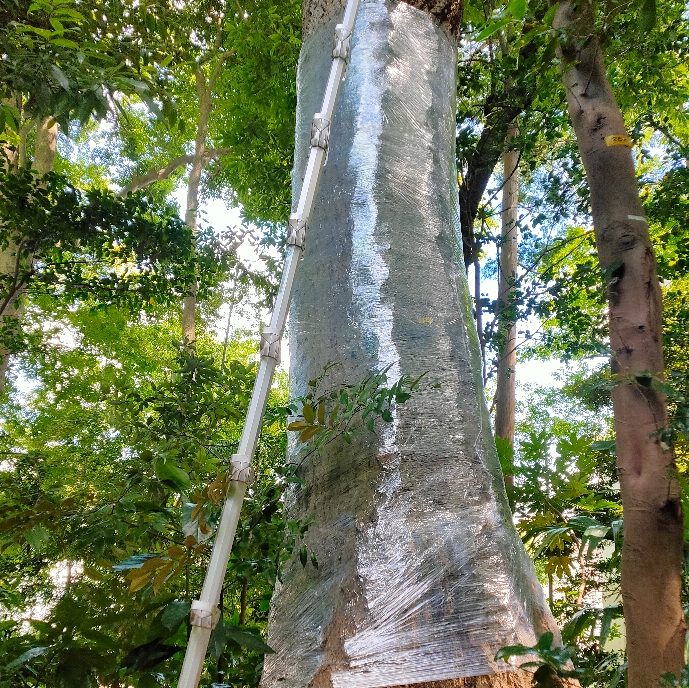 翌朝7月28日、家に残っていた水性ペンキで酷い部分を被覆。残念ながら全部を塗るほどペンキは残っていなかったが、穿孔の酷い部分は処置できたと思う。その後、根元がすっかり覆われるように入念にフィルムを巻いていった。