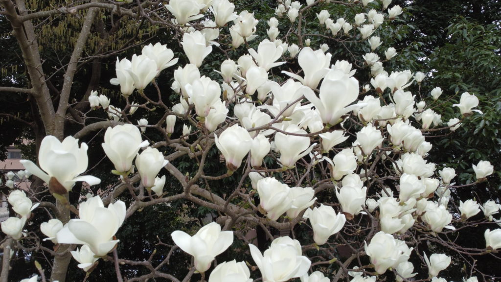 世間はサクラの開花で騒がしいが、天神山には、この冬植樹した苗以外にサクラはない。そのかわり、マグノリアの代表格、ハクモクレンが満開だ。樹高17m、胸高直径27㎝の堂々たる大木である。幹は柔らかく登るには勇気がいる。満開の期間は短く2、3日もすれば、花びらが開き、落ち始める。この「花びら」、正確には花被片といい、ガクと花弁が分化していない。被子植物としては初期に登場したと思われ、APG分類では、単子葉植物の前に分類されている。簡単に言えば、白亜紀に登場した昔の木なのである。1億3千年まえに恐竜や昆虫とともに進化し登場したといわれている。マグノリアの仲間は、他にコブシ、タンザンボク、オガタマノキなどがあるが、花は大きめで匂いが強い。