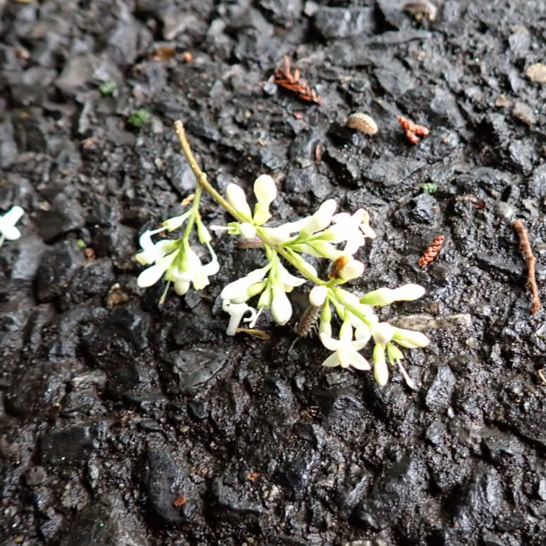 ふと足下を見ると、白い小さな花が落ちていた。この季節、ちょっと見回せばあちこちで蕾や実や小さな花に出逢う。写真はネズミモチ。実は女貞子といって若返りの薬効があり人気だ。