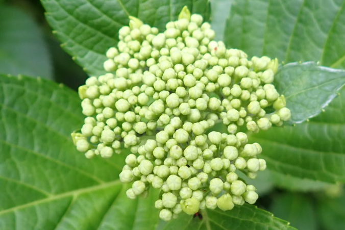 ガクアジサイ。伐採絡みで、4年本格的な花を付けなかったが、今年は可憐な花が見られそうだ。とは言っても花びらのように見えるのはアジサイの萼なのだが。
